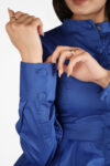 - This peplum-style blouse features a vintage Mandarin collar that elegantly sits above the neckline, exuding timeless grace.