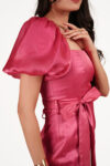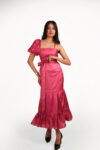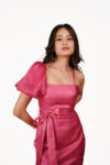 • Design: Striking hot pink one-shoulder silhouette with a detachable ribbon tie that can be styled at the front or back.
