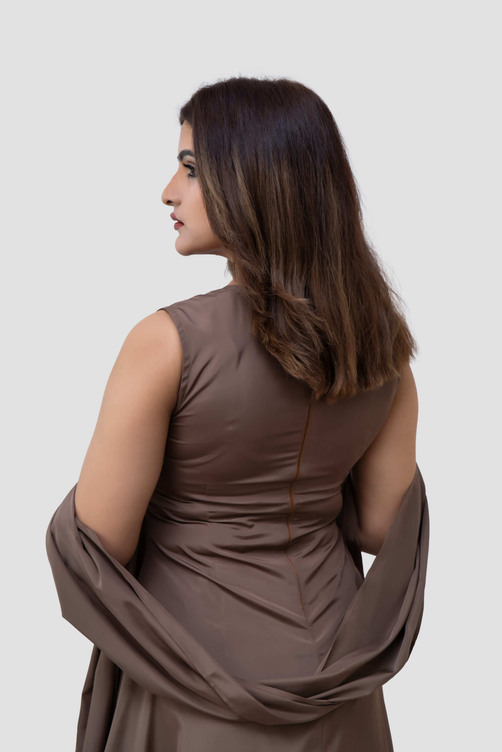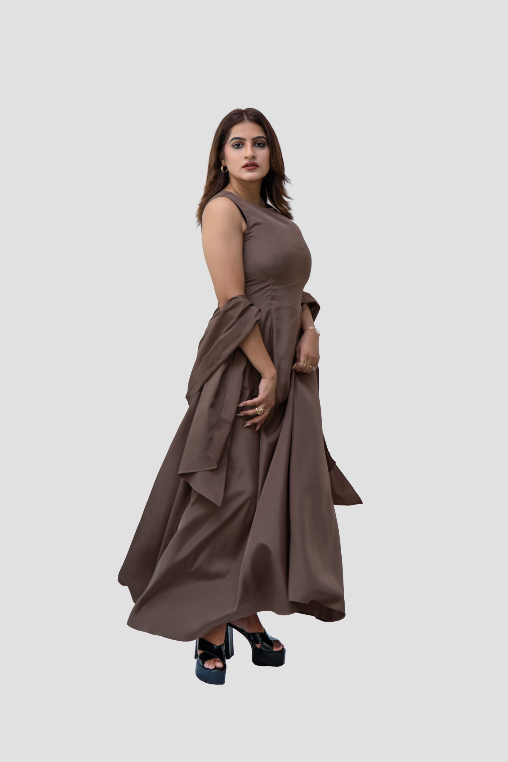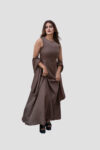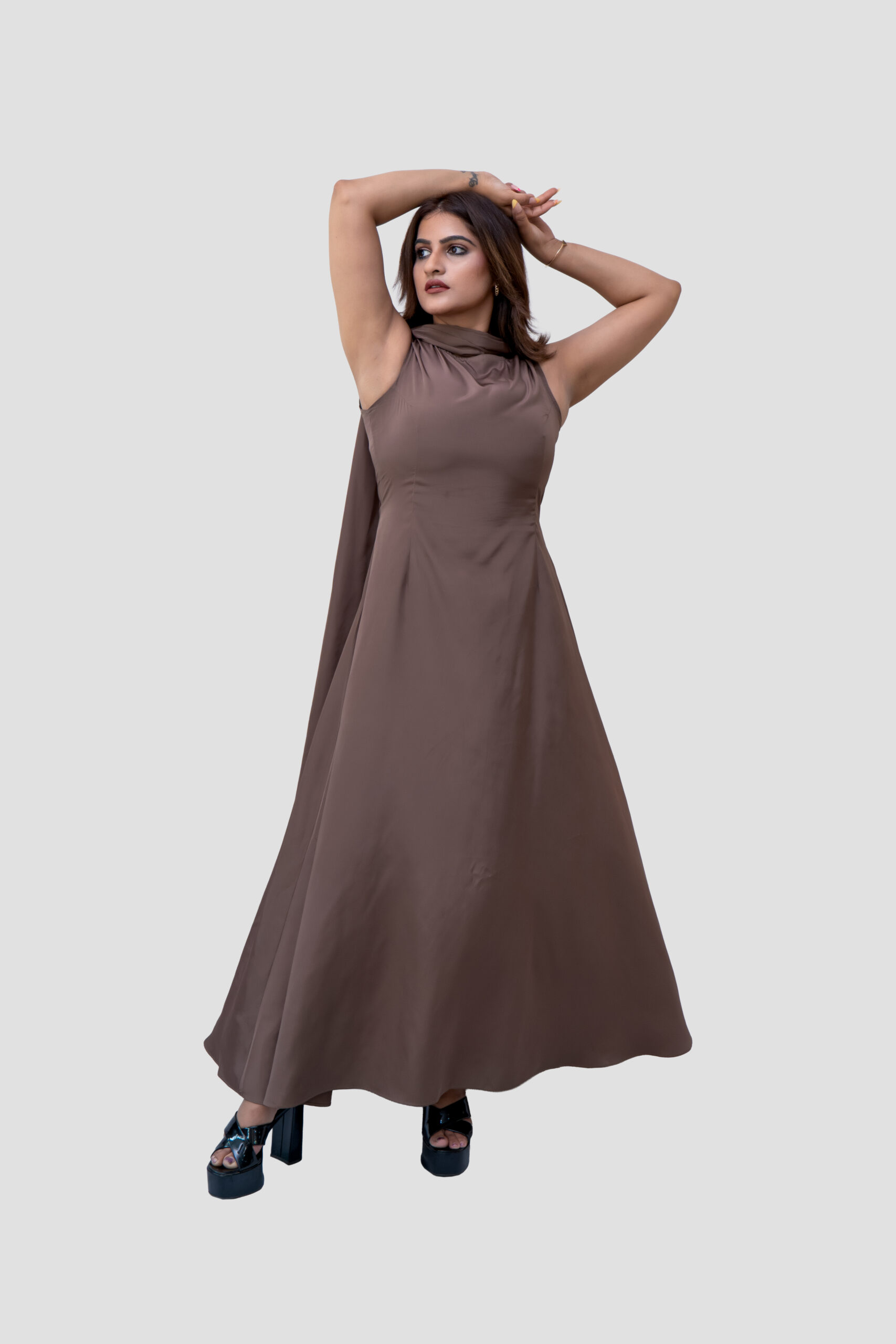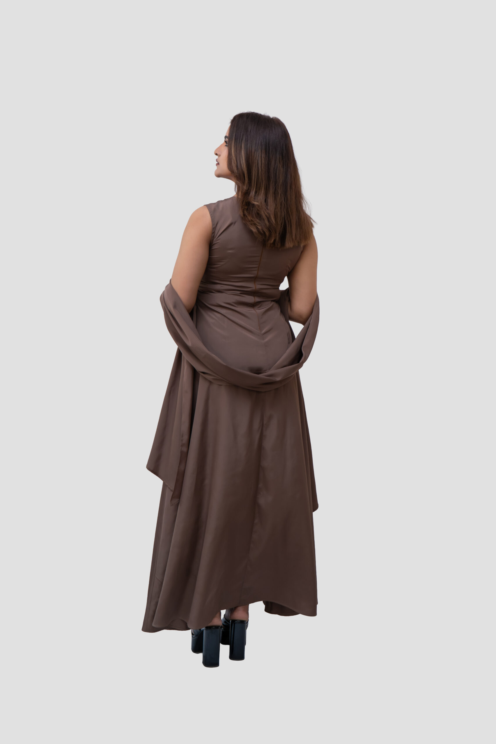 Design: A minimalist sleeveless maxi dress in a rich mocha tone. Features scarf for elegant look
