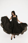 Design: A romantic square-neck midi dress with wide shoulder straps tied into dramatic statement bows. The skirt flows into a voluminous A-line shape with a circular flare.