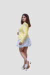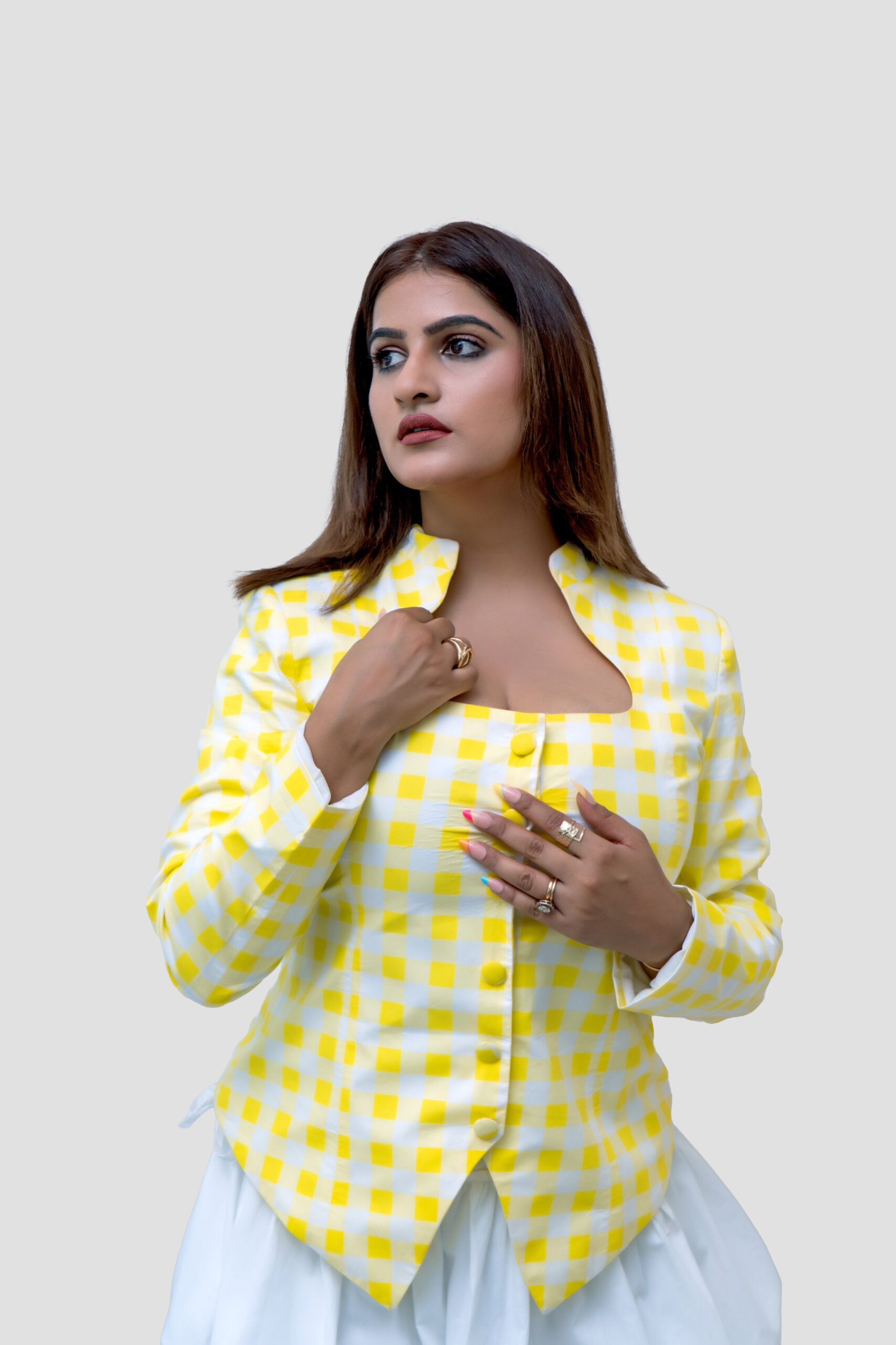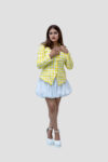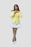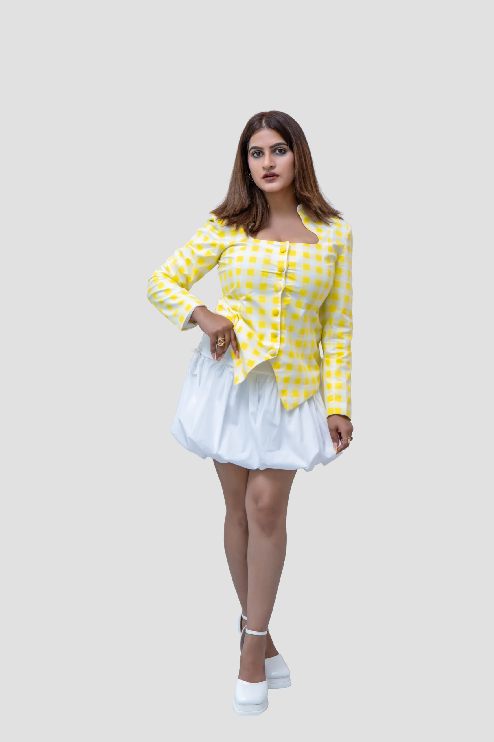 Fabric: Cotton poplin soft yet structured, offering a crisp silhouette with ease of movement. Design: A playful yet polished set that pairs a tailored gingham blazer with a voluminous balloon mini skirt creating a striking, modern silhouette.